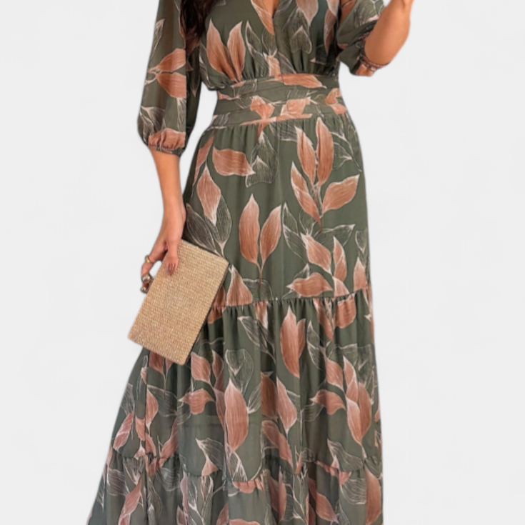 Aísha Vestido Largo Floral con Corte Fluido y Motivo de Hojas