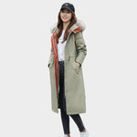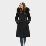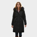 Este abrigo largo para mujer con capucha de pelo combina elegancia y funcionalidad para los días más fríos del año. Su diseño moderno con corte ajustable realza la figura, mientras que la capucha con borde de pelo añade un toque sofisticado y acogedor.