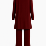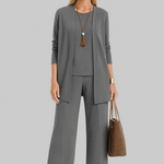 Descubre la sofisticación atemporal con nuestro conjunto Amelia, un conjunto versátil de tres piezas diseñado para un estilo effortless. Elaborado con un tejido lujoso y suave, este outfit incluye un cardigan fluido, una parte superior ajustada y pantalones de pierna ancha, perfectos tanto para entornos profesionales como salidas casuales. Disponible en colores ricos como negro y burdeos profundo, ofrece un ajuste favorecedor y comodidad todo el día.