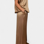 • Blusa suelta y pantalón amplio que aportan un movimiento fluido