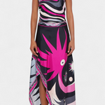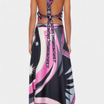 El conjunto Ciana celebra la expresión personal a través del color, la forma y la textura. Su top halter ajustado realza la figura con un toque contemporáneo, mientras la falda en línea A fluye con movimiento natural gracias a su suave tejido satinado. El estampado abstracto en negro y rosa crea un contraste visual llamativo, ideal para destacar tanto de día como de noche.
