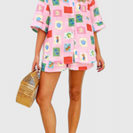 Diseñado para un estilo y comodidad sin esfuerzo, este conjunto de dos piezas presenta una camisa de botón relajada con un cuello con solapa y pantalones cortos de tiro alto con una cinturilla elástica. La divertida estampado múltiple añade un toque vibrante, convirtiéndolo en la opción perfecta para días cálidos y aventuras soleadas.
