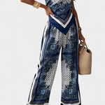 Haz girar cabezas con el Conjunto de Bufanda Paisley: una mezcla ligera de estampado audaz y elegancia relajada. Con su top bandeau con tiras y pantalones de pierna ancha fluidos, este conjunto captura la esencia de la sofisticación despreocupada para días cálidos y noches inolvidables.