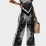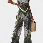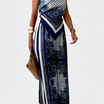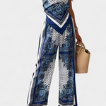 Haz girar cabezas con el Conjunto de Bufanda Paisley: una mezcla ligera de estampado audaz y elegancia relajada. Con su top bandeau con tiras y pantalones de pierna ancha fluidos, este conjunto captura la esencia de la sofisticación despreocupada para días cálidos y noches inolvidables.