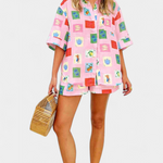 Fresco, alegre y perfecto para los días soleados. El conjunto Mariluz combina una camisa de manga corta con cuello solapa y botones frontales, junto a unos shorts de cintura alta con cinturilla elástica y cordón ajustable. Con un estampado vibrante y silueta relajada, este look veraniego te acompaña con ligereza y estilo.