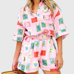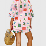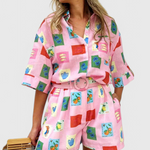 Diseñado para un estilo y comodidad sin esfuerzo, este conjunto de dos piezas presenta una camisa de botón relajada con un cuello con solapa y pantalones cortos de tiro alto con una cinturilla elástica. La divertida estampado múltiple añade un toque vibrante, convirtiéndolo en la opción perfecta para días cálidos y aventuras soleadas.