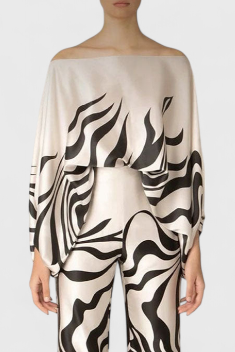 El conjunto Sybella combina una blusa con hombros descubiertos y mangas de farol con pantalones de pierna ancha y estampado artístico. Diseñado para ofrecer una silueta fluida con personalidad, es perfecto para días soleados, escapadas relajadas o encuentros con estilo.