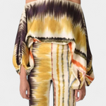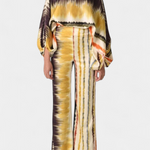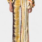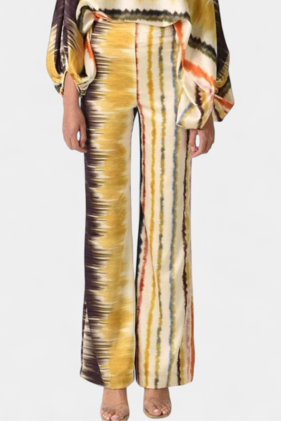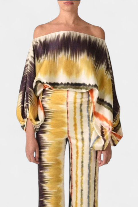 El conjunto Sybella combina una blusa con hombros descubiertos y mangas de farol con pantalones de pierna ancha y estampado artístico. Diseñado para ofrecer una silueta fluida con personalidad, es perfecto para días soleados, escapadas relajadas o encuentros con estilo.