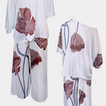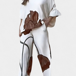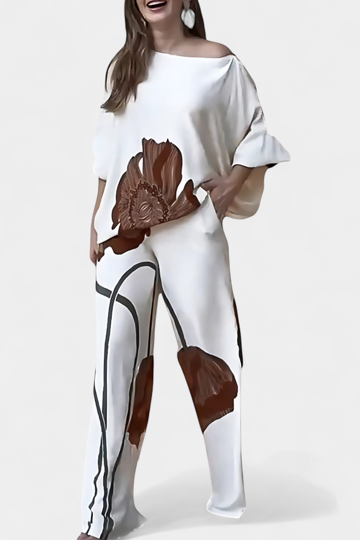 El conjunto Jessie fusiona un top asimétrico de manga murciélago con un estampado floral llamativo y un pantalón recto de ajuste holgado. Diseñado para ofrecer libertad de movimiento y un aire relajado pero con carácter.