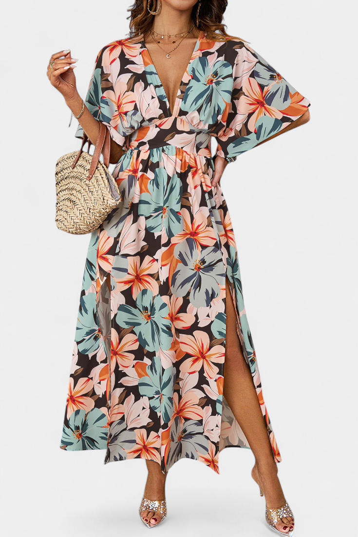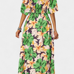 Estilo envolvente con un aire de frescura veraniega. El vestido Elena deslumbra con su estampado floral vibrante, escote cruzado pronunciado y abertura lateral que aporta movimiento y encanto. Diseñado para quienes buscan destacar con elegancia en climas cálidos y ocasiones relajadas.