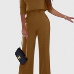 El conjunto Cleo fusiona elegancia relajada con un diseño estructurado que realza la silueta. Su top de manga 3/4 aporta un aire clásico y refinado, mientras que el pantalón de pierna ancha crea una línea alargada y sofisticada. Ideal para quienes buscan estilo sin esfuerzo con acabados cuidados.
