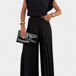 Minimalismo sofisticado con una silueta poderosa y femenina. El conjunto Liora destaca por su top sin mangas con espalda abierta y hombreras definidas, combinado con pantalones plisados de pierna ancha que fluyen con elegancia. Una fusión perfecta de comodidad y estilo pulido.