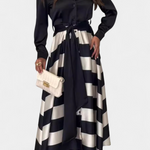 Gráfico, sofisticado y moderno, el vestido Nessia reinventa la silueta camisera con un giro editorial. Las rayas audaces, la falda amplia y el cinturón a juego lo convierten en una pieza impactante para destacar con elegancia en cualquier ocasión.