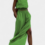 Portia es la definición de elegancia veraniega sin esfuerzo. Confeccionado en una mezcla ligera de algodón y lino, este conjunto de dos piezas combina líneas limpias con funcionalidad. Las aberturas laterales y el diseño sin mangas aportan un aire moderno, mientras que la silueta amplia garantiza comodidad en cada paso.