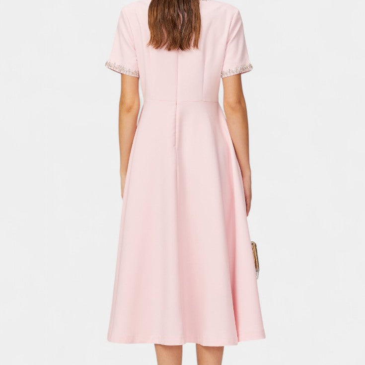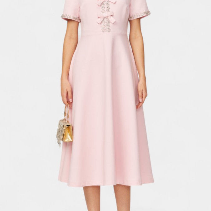 Linda Vestido Midi Acampanado con Lazo de Cristal y Detalles Elegantes