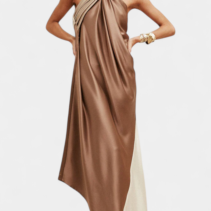 Rebecca Vestido Maxi Irregular de Color Bloque con Espalda Descubierta
