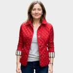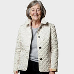 Esta chaqueta acolchada presenta un patrón de costura en rombos que le confiere un estilo clásico y una textura sutil. El cuello vuelto y el corte estructurado proporcionan una silueta elegante, mientras que los detalles con botones en los dobladillos y en la parte trasera de la cintura añaden un toque de refinamiento. Su confección ligera ofrece calidez sin volumen, ideal para llevar en capas en las estaciones más frías.