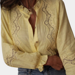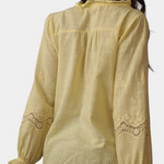 Deja que entre el sol con la Blusa de Encaje Catarina, una mezcla romántica de suave feminidad y encantadora bohemia sin esfuerzo. Esta pieza de ensueño presenta delicados paneles de encaje, mangas ligeramente abullonadas y un favorecedor frente abotonado. El cálido tono amarillo ilumina tu look mientras que el intrincado bordado añade un toque de alma vintage.