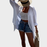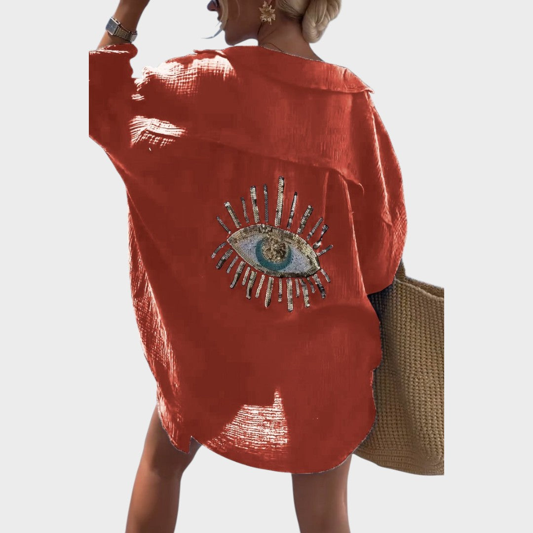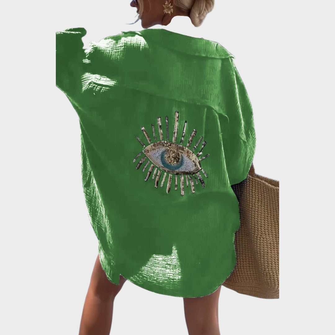 Selena es una camisa que combina simbolismo y estilo. Con un bordado inspirado en el ojo protector y delicados detalles de lentejuelas y cuentas, le da un toque sofisticado y femenino. Su tejido ligero y corte holgado la convierten en la prenda ideal para los calurosos días de verano o como segunda capa para los días menos soleados.