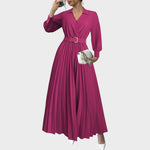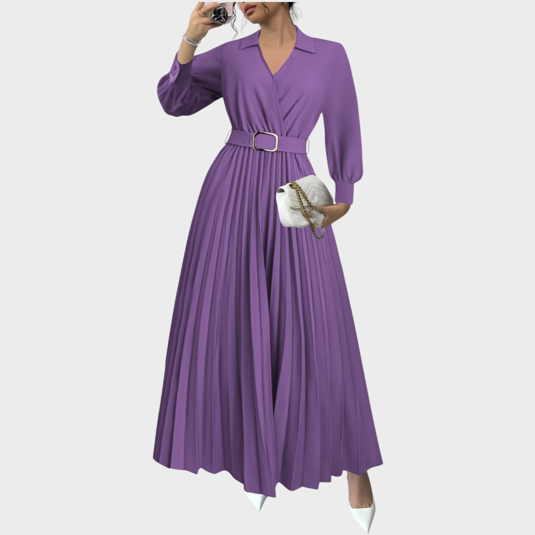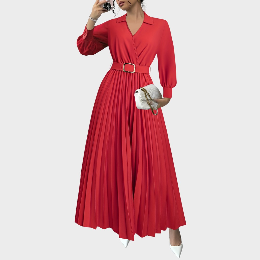 El vestido Margot presenta un favorecedor escote en V y mangas largas con puños, para un look equilibrado y refinado. La cintura ajustada se acentúa con un cinturón a juego y un detalle de hebilla dorada, mientras que la falda larga plisada añade un bonito movimiento y elegancia. Una elección perfecta para un estilo sofisticado y cómodo para el día a día.