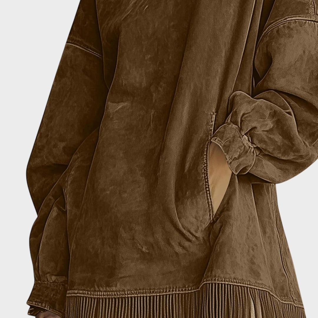 • Diseño sofisticado y elegante: El vestido Sheri está confeccionado en ante, con un tacto suave y sofisticado, perfecto para quienes buscan un look moderno y refinado. El fleco en el bajo le añade un toque único y con estilo.