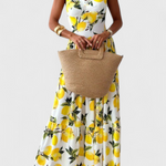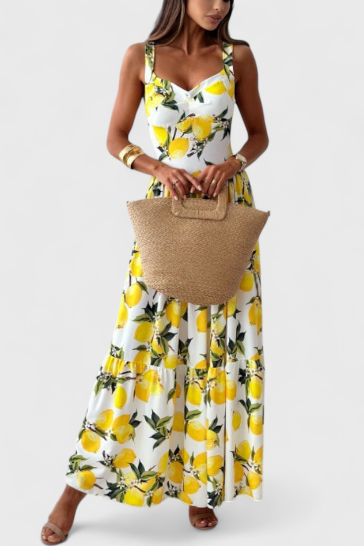 Huda Vestido Maxi Estampado de Limones con Tirantes y Abertura Lateral